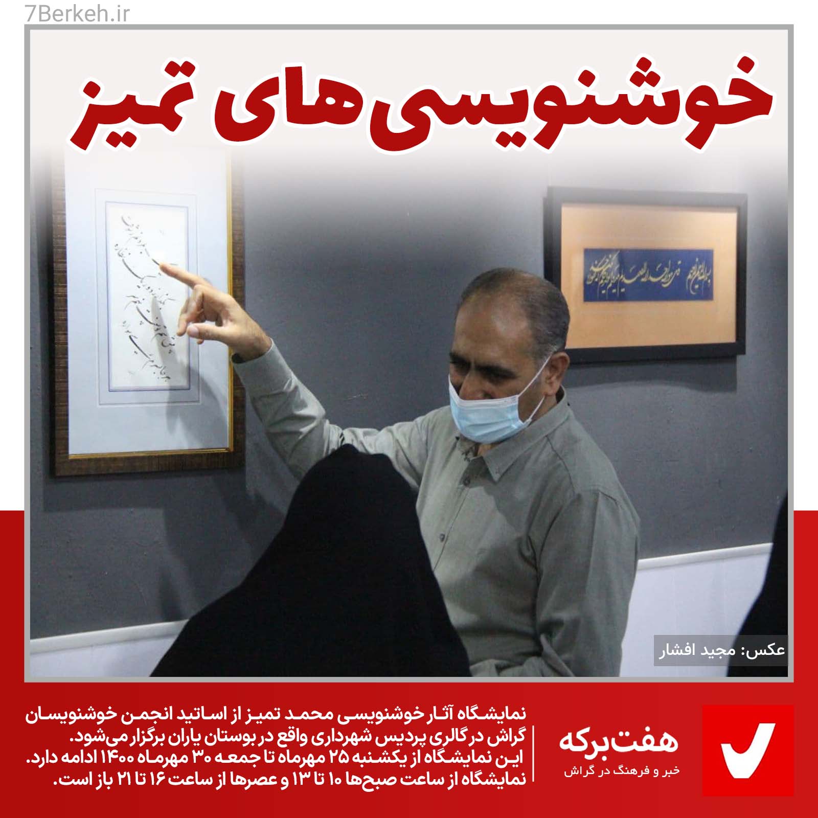 به گزارش هفتبرکه، نمایشگاه آثار خوشنویسی محمد تمیز به مناسبت هفته خوشنویسی یکشنبه ۲۵ مهرماه ۱۴۰۰ با حضور رییس اداره فرهنگ و ارشاد اسلامی گراش و جمعی از هنر دوستان در گالری پردیس واقع در بوستان یاران برپا گشایش یافت.