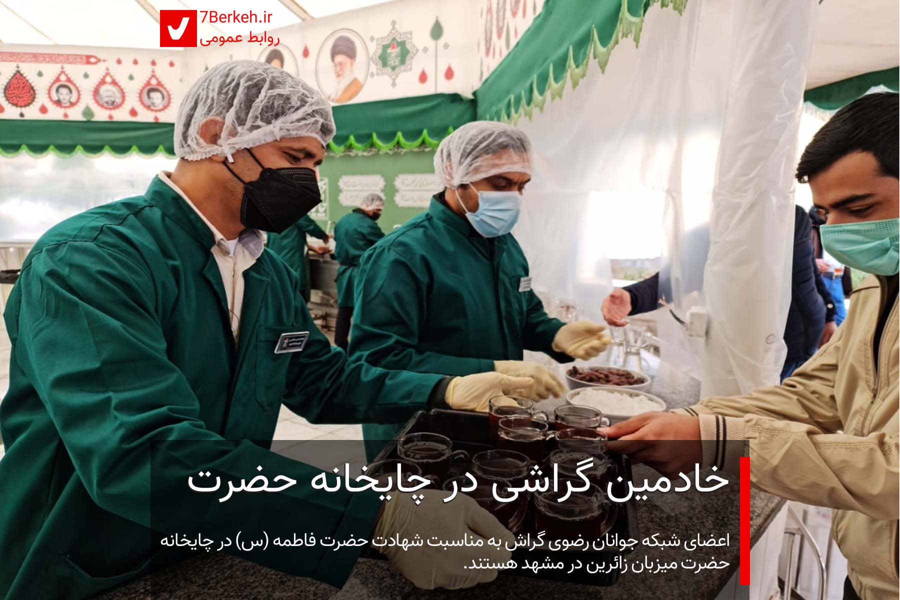 به گزارش هفتبرکه، خادمین گراشی سیزدهم تا شانزدهم دیماه۱۴۰۰ به مناسبت ایام فاطمیه در چایخانه حضرت در صحن غدیر حرم مطهر امام رضا (ع) از عزادارن فاطمی و زائرین حرم پذیرایی میکنند.