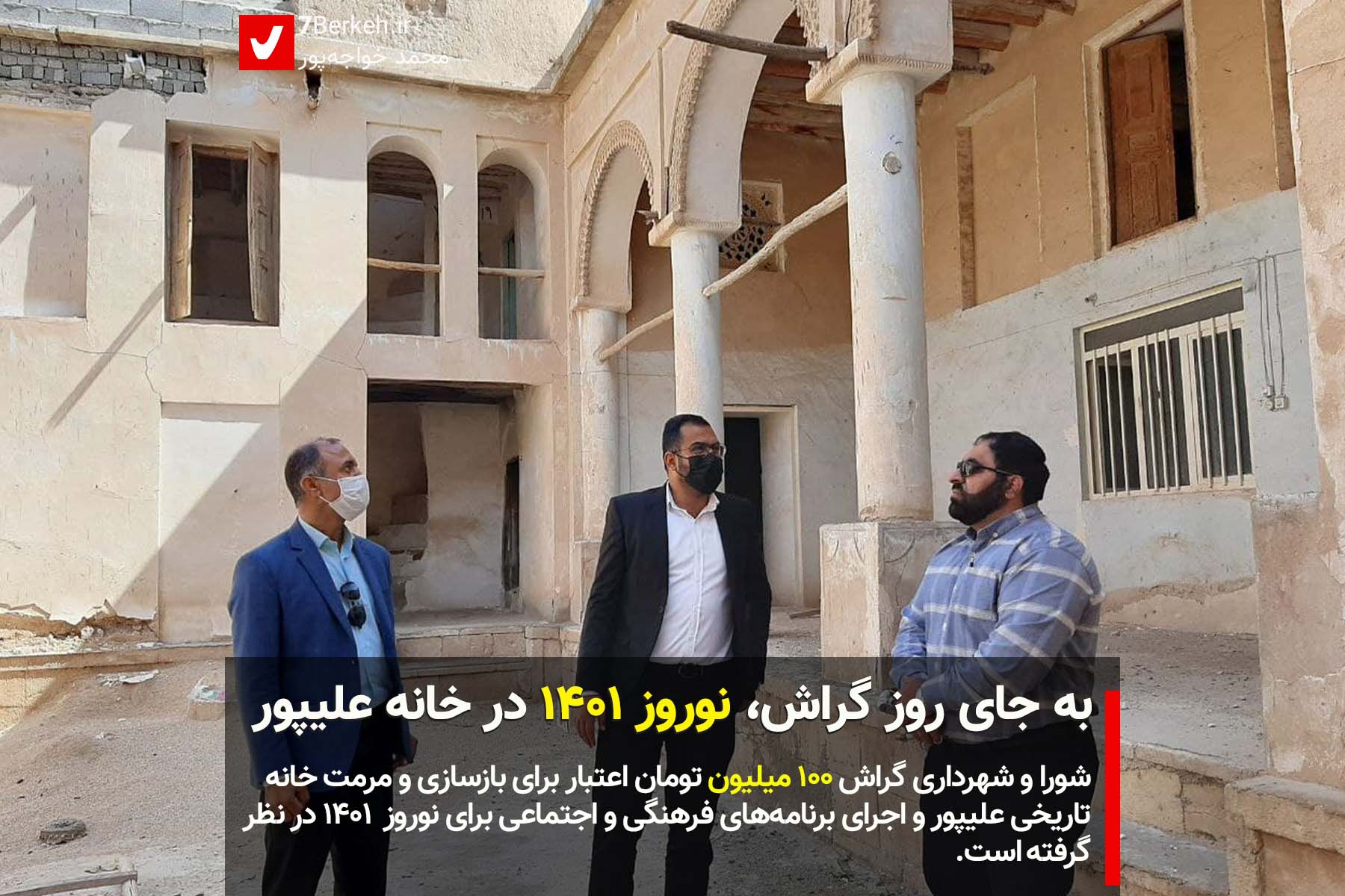 به گزارش هفت‌برکه، مراسم روز گراش امسال با توجه به آغاز پیک ششم، از یازدهم بهمن‌ماه به هفته اول اسفند موکول شد. اما با توجه به ادامه روند محدودیت‌های  کرونایی شهرستان گراش، شورای شهر در نظر دارد که اعتبار این برنامه را به خانه تاریخی علیپور اختصاص دهد. قرار است نوروز امسال خانه علیپور میزبان برنامه‌های فرهنگی و اجتماعی باشد.