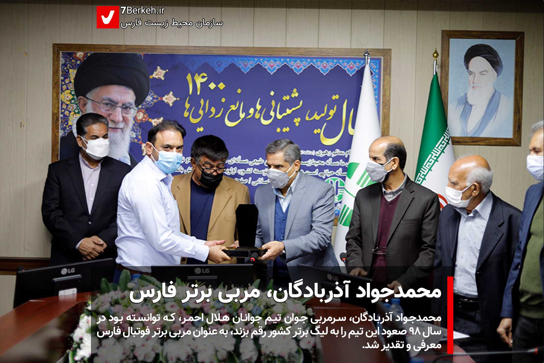هفتبرکه: محمدجواد آذربادگان، سرمربی جوان تیم جوانان هلال احمر، که توانسته بود در سال ۹۸ صعود این تیم را به لیگ برتر کشور رقم بزند، به عنوان مربی برتر فوتبال فارس معرفی و تقدیر شد.