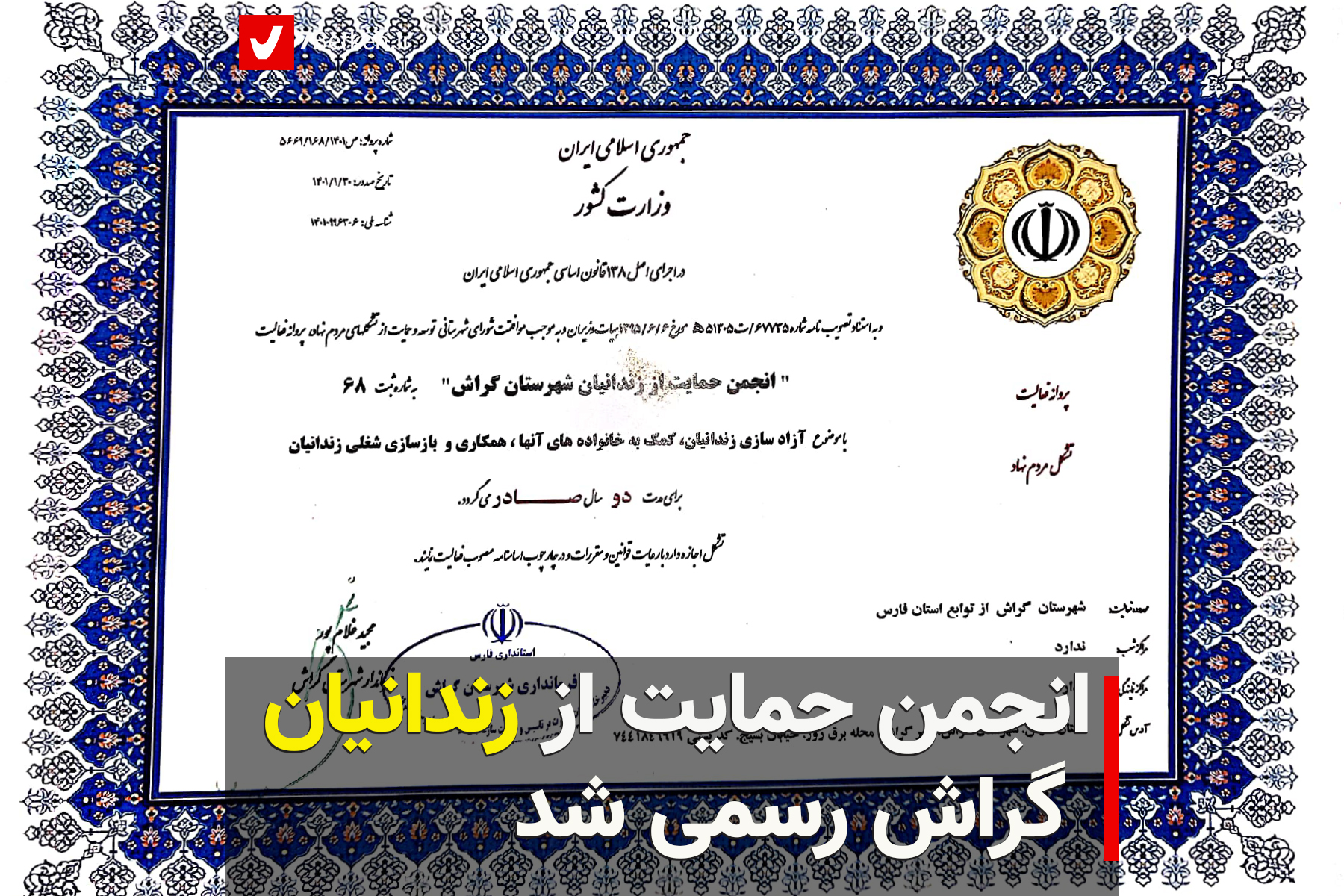 به گزارش هفتبرکه، آذرماه سال ۹۹ انجمن حمایت از زندانیان شهرستان گراش تشکیل و حالا با گذشت ۱۷ ماه از تشکیل این انجمن مجوز فعالیت آن از سوی شورای توسعه شهرستانی و حمایت از تشکلهای مردمنهاد صادر شد.
