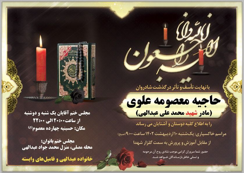 هفتبرکه : ۹ اردیبهشت ۱۴۰۲ معصومه علوی مادر شهید محمدعلی عبداللهی درگذشت تا یک مادر فداکار دیگر از جمع کم تعداد مادران شهید کاسته شود. محمدعلی عبدالهی فرزند حاج امرالله ۷ مرداد ۱۳۶۲ در عملیات والفجر ۳ در سن ۲۲ سالگی به شهادت رسید.
