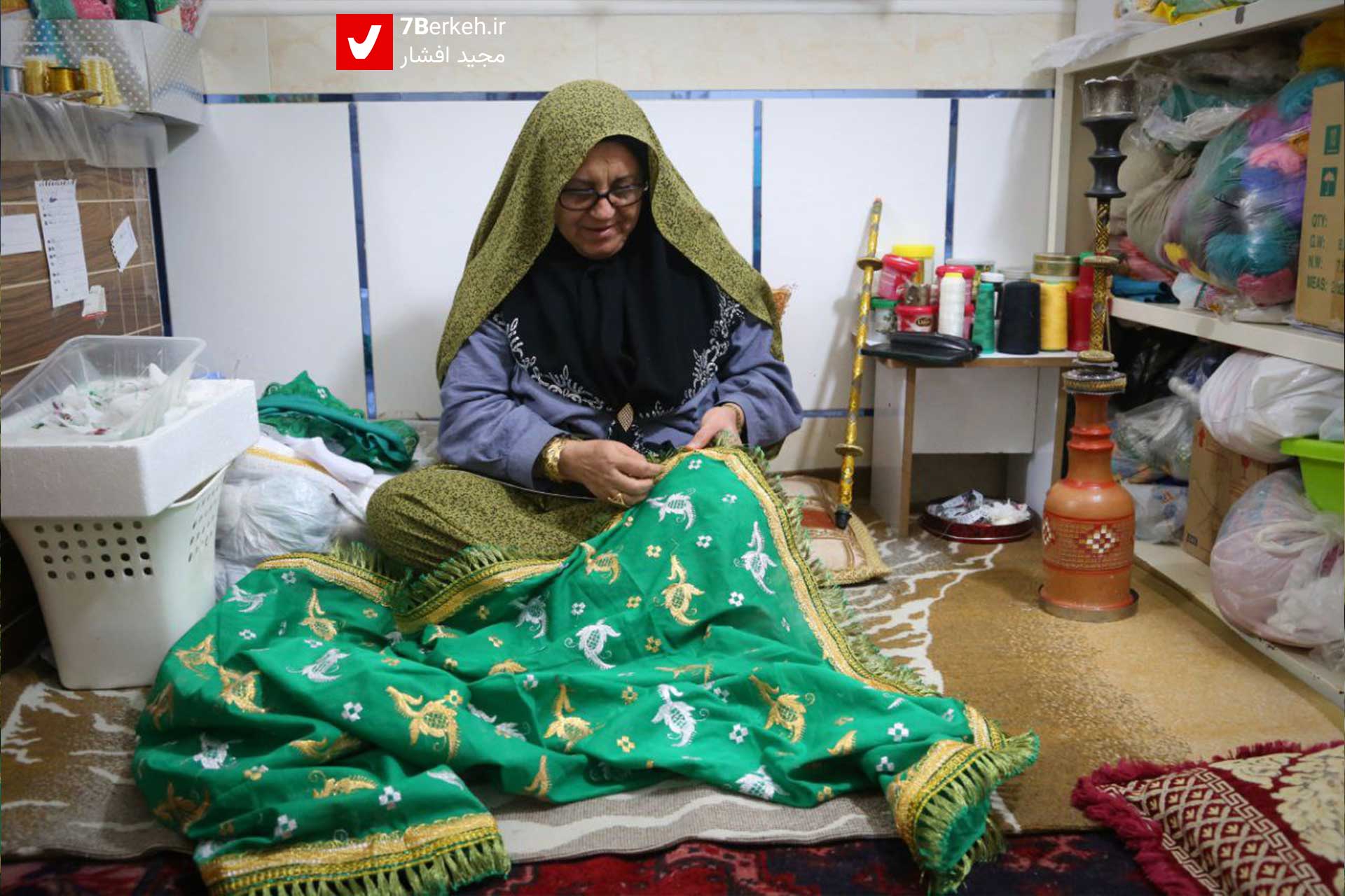 فاطمه خانم میگوید، بچههایش به او کمک میکنند و اضافه میکند: «مثلا پَک (دایره پارچهای) پشهگیر پولکدوزی میکنند، یا عروسکها را بخیه میکنند.»