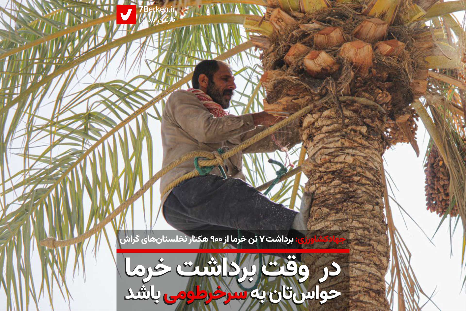 به گزارش روابط عمومی مدیریت جهاد کشاورزی گراش، حسن مرادی گفت: «برداشت از نخلستانهای این شهرستان از مردادماه با خارک و رطب آغاز شده و برداشت خرما نیز از مهرماه شروع و تا آبانماه ادامه خواهد داشت.»