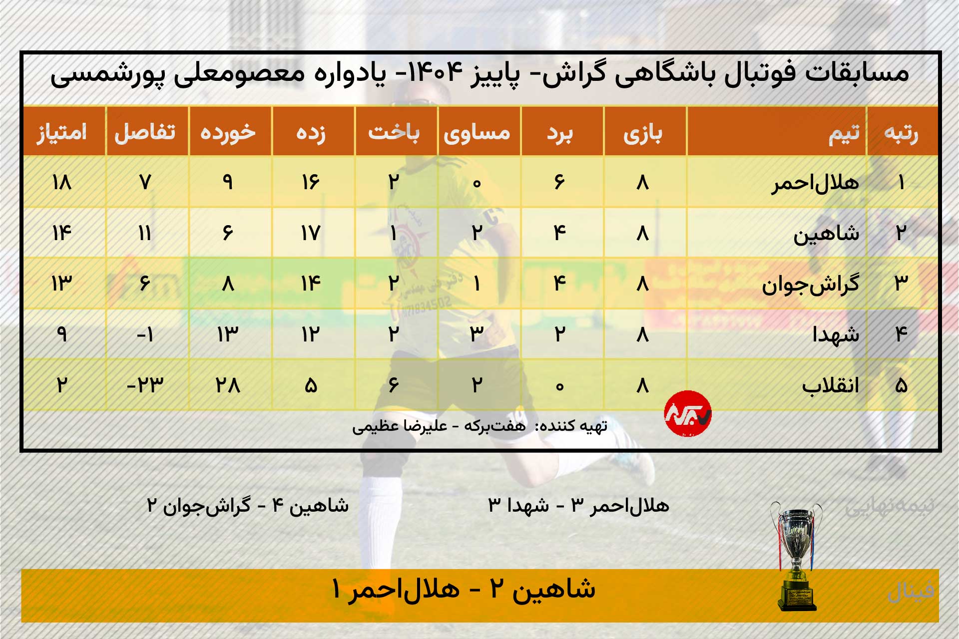 پس از دو ماه مسابقه سهشنبه شب ۲۰ آبان ۱۴۰۴ در ورزشگاه شهدای گراش شاهین با برد یک – صفر برابر هلالاحمر، در نهایت قهرمان مسابقات فوتبال گراش در سال ۱۴۰۴ شد.