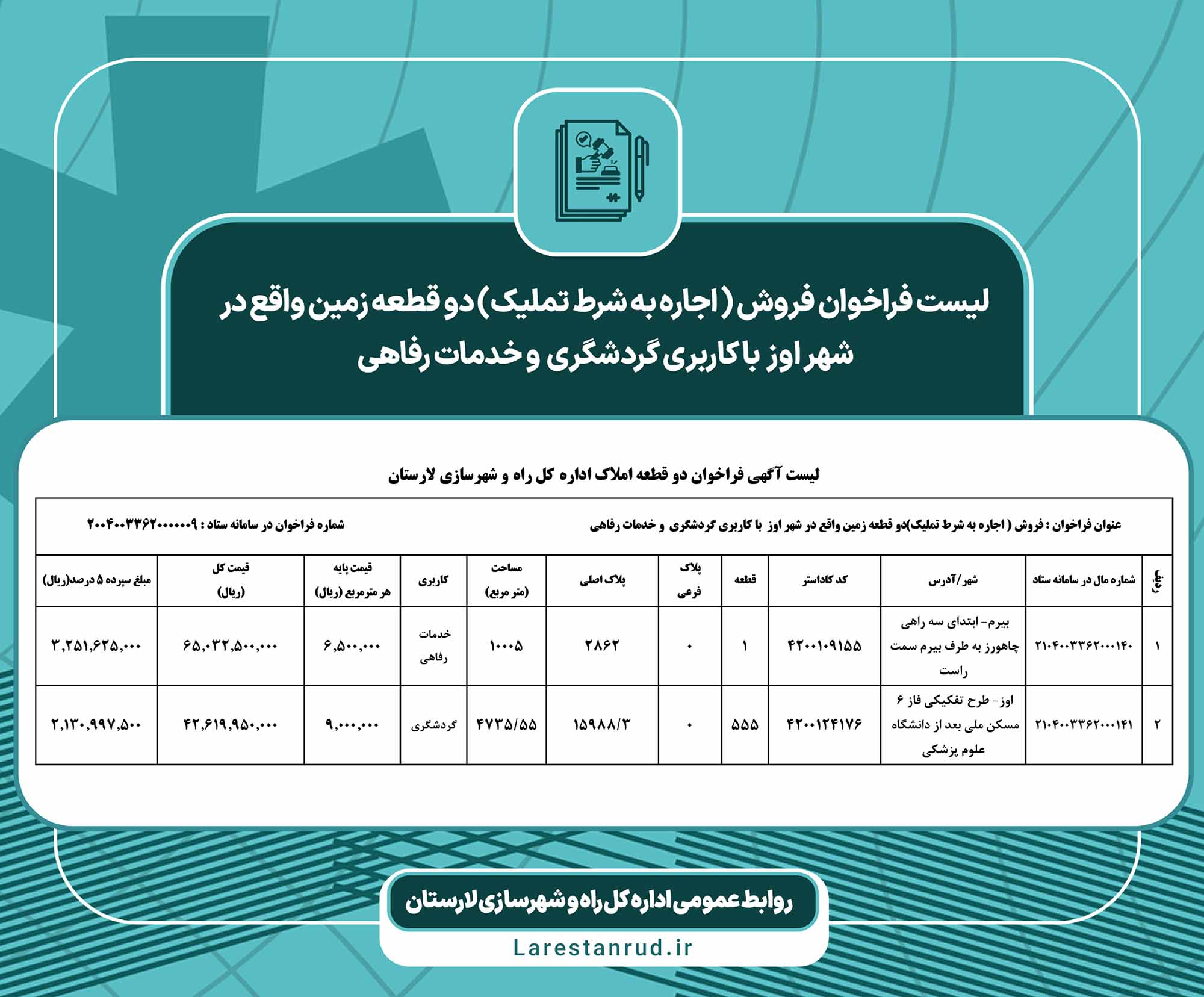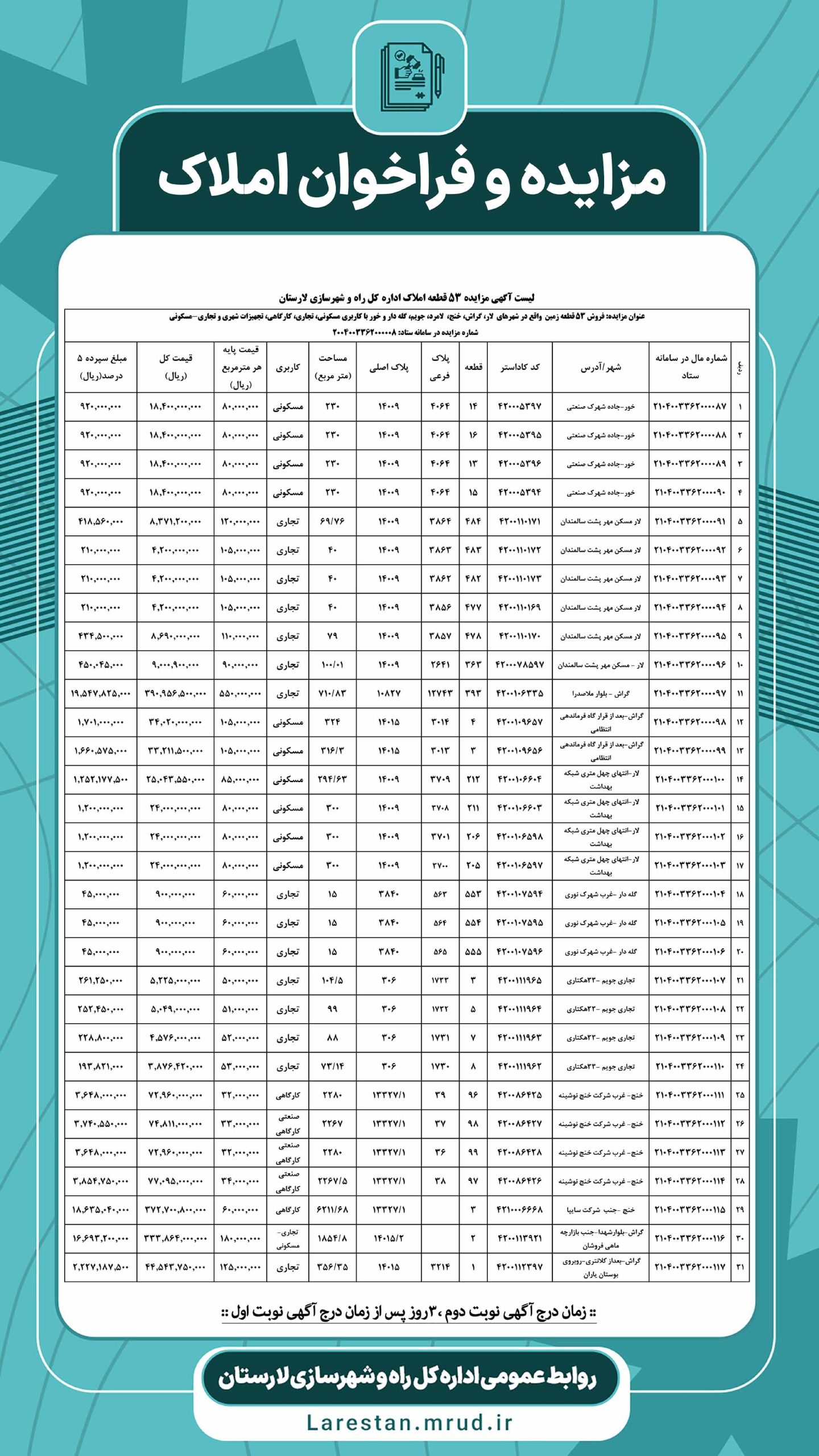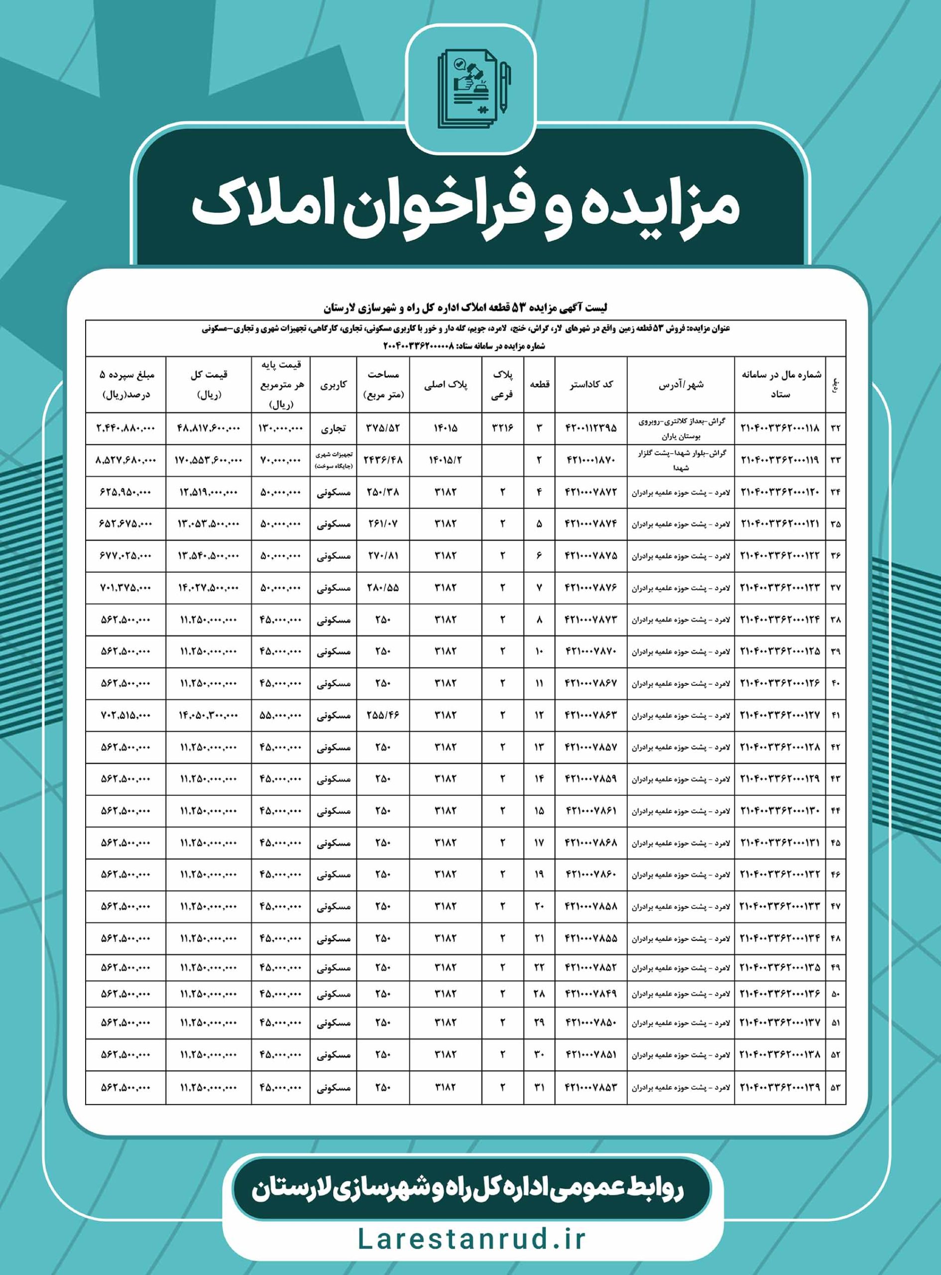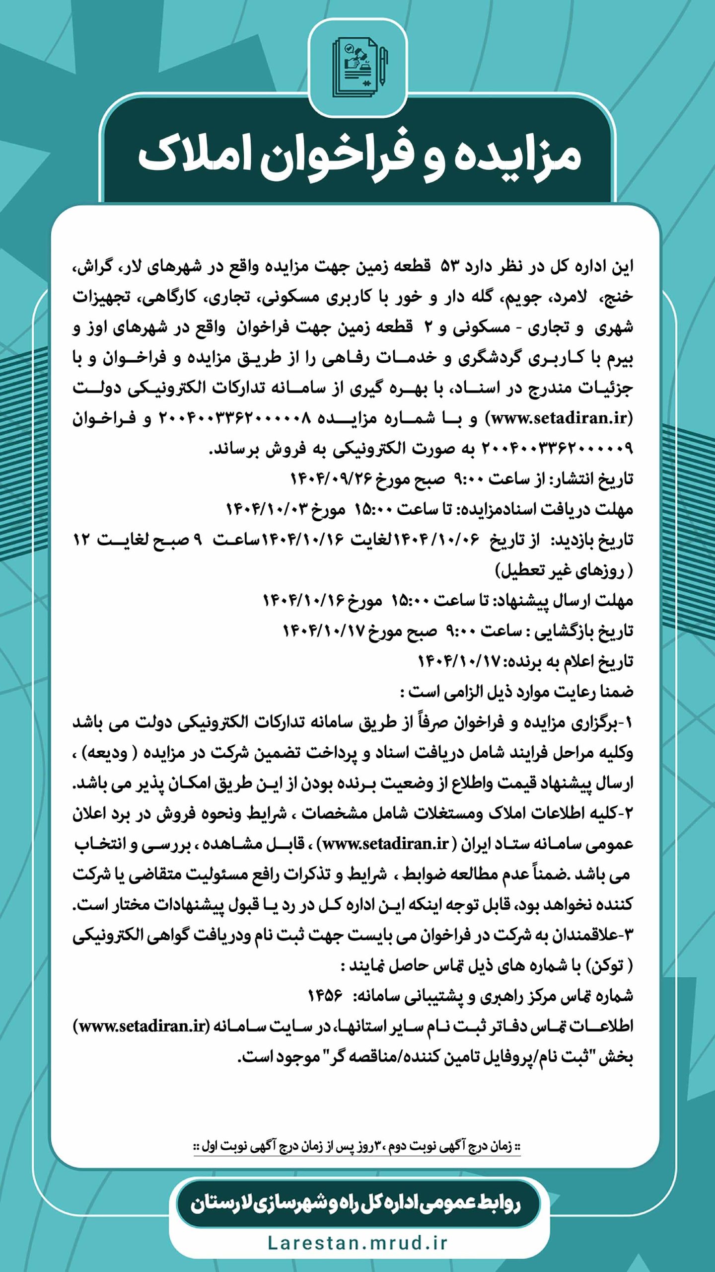 بر اساس اطلاعیهی مزایده و فراخوان املاک اداره کل راه و شهرسازی لارستان، تعداد ۵۳ قطعه زمین با کاربریهای مسکونی، تجاری، کارگاهی، تجهیزات شهری و تجاری-مسکونی در لیست فروش قرار گرفته است. فردا ۱۶ دیماه ۱۴۰۴ آخرین مهلت ارسال درخواستها در سایت www.setadiran.ir است.