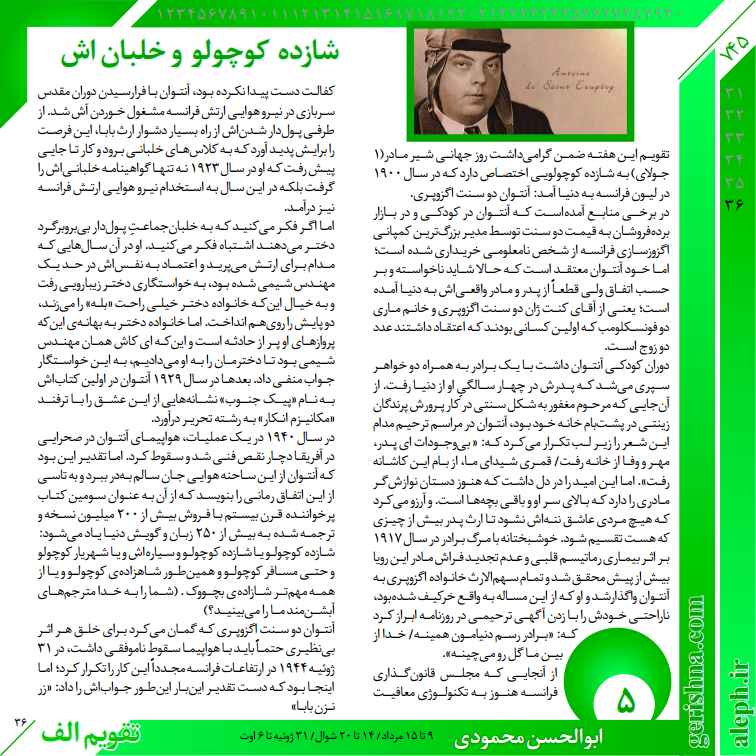 تقویم این هفته ضمن گرامیداشت روز جهانی شیر مادر(۱ جولای) به شازده کوچولویی اختصاص دارد که در سال ۱۹۰۰ در لیون فرانسه به دنیا آمد: آنتوان دو سنت اگزوپری.