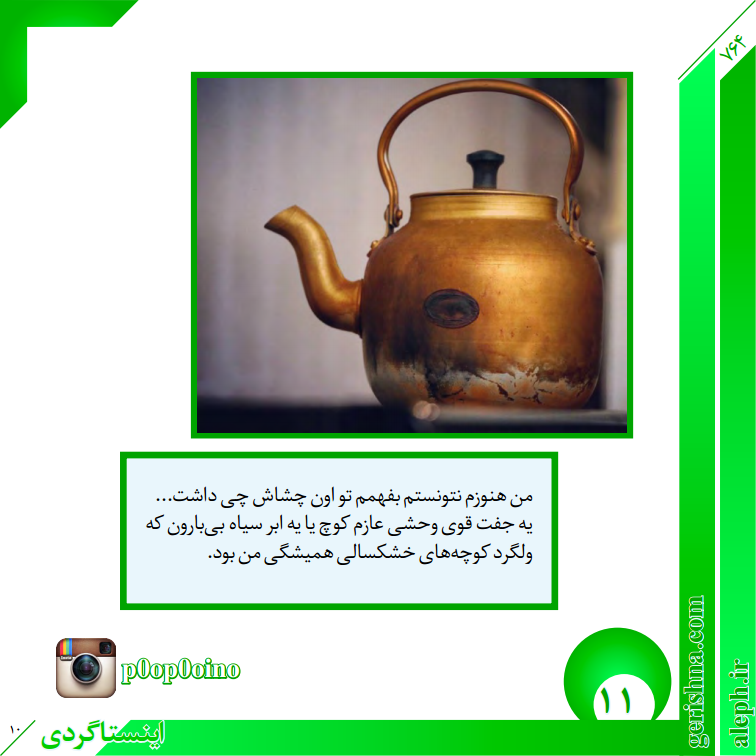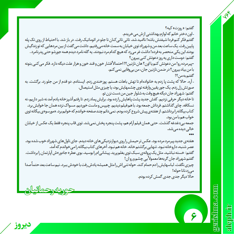 ایستاده بودم بیتکان. انگار چیزی آن وسط گم شده بود. خوب که اشکها روی پارکت چکید از اتاق شهرزاد بیرون آمدم. توی هال روی کاناپه ولو شدم. چقدر دلم یک لیوان شیر نسکافه میخواست. نداشتیم. نه شیر، نه نسکافه.