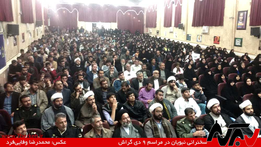 ۷ دیماه، دو روز مانده به سالگرد ۹ دی، حجتالاسلام سید محمود نبویان، نماینده مجلس و عضو جبهه پایداری، در گراش سخنرانی کرد. نبویان به دعوت ناحیه مقاومت بسیج سپاه گراش و پایگاه مقاومت علی ابن ابیطالب (ع) به گراش سفر کرد. سخنرانی نبویان ساعت ۱۸ و سی دقیقه در سالن سراجی برگزار شد. فتنه، برجام، و دیپلماسی لبخند از مهمترین موضوعات سخنرانی عضو کمیسیون ویژه برجام در مجلس شورای اسلامی بود.