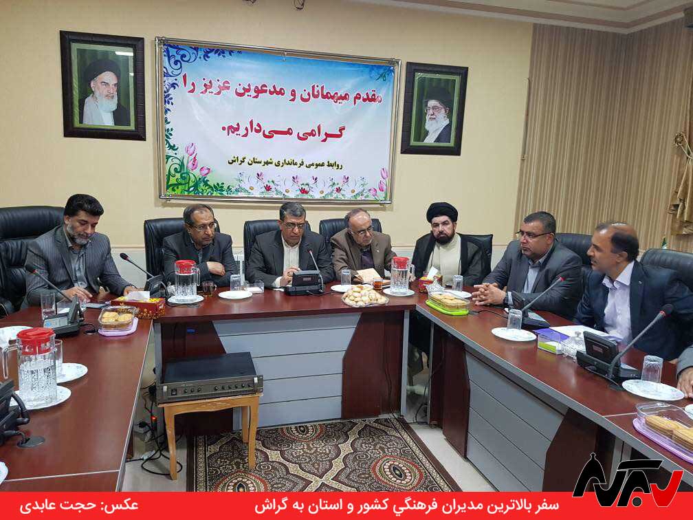 به گزارش هفتبرکه، سهشنبه سوم مردادماه، دکتر حسینی، معاون حقوقی و امور مجلس و استانهای وزارت فرهنگ و ارشاد اسلامی؛ دکتر جعفرپور، رییس کمیسیون فرهنگی مجلس شورای اسلامی و نمایندهی مردم لارستان، خنج و گراش؛ و دکتر مریدی، مدیر کل فرهنگ و ارشاد اسلامی فارس به گراش سفر کردند. در نشستی که با حضور این مدیران بلندپایه و فرماندار شهرستان گراش، رییس اداره فرهنگ و ارشاد اسلامی گراش و جمعی از مسئولین و فعالات فرهنگی در محل سالن اجتماعات فرمانداری شهرستان گراش برگزار شد، فرهنگوران و هنرمندان گراش دربارهی امتیازها و مسائل و مشکلات فرهنگی شهر صحبت کردند.