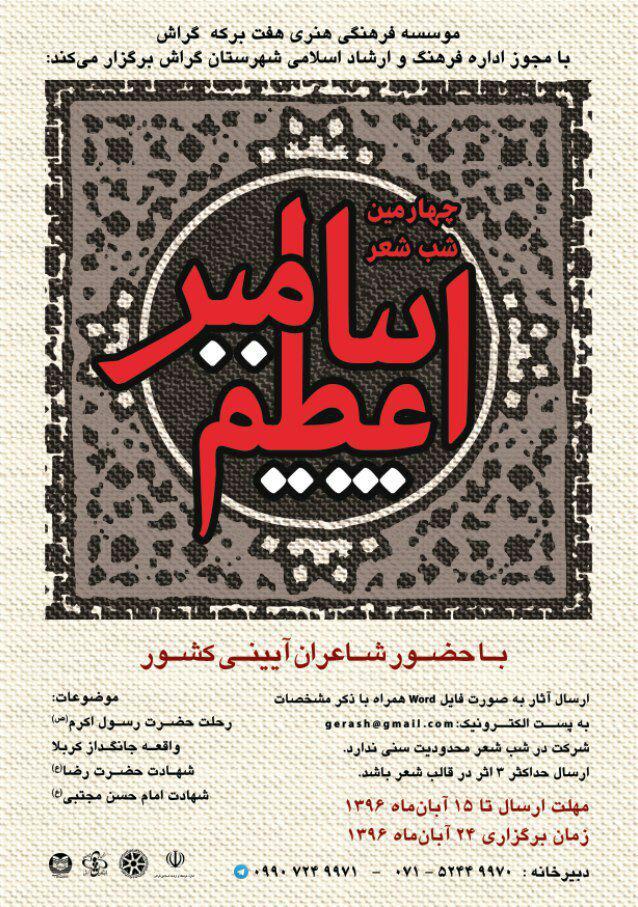 چهارمین شب شعر با همکاری اداره فرهنگ و ارشاد اسلامی گراش، کانون فرهنگی مذهبی روایت آفتاب و انجمن شاعران و نویسندگان گراش برگزار میشود.