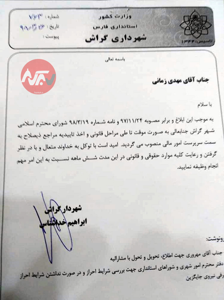 در این نامه آمده است: «به موجب این ابلاغ و برابر مصوبه ۲۴/۱۱/۹۷ و نامه شماره ۱۹/۳/۹۸ شورای محترم اسلامی شهر گراش جنابعالی به صورت موقت تا طی مراحل قانونی و اخذ تاییدیه مراجع ذیصلاح به سمت سرپرست امور مالی منصوب میگردید. امید است با توکل به خداوند متعال و با در نظر گرفتن و رعایت کلیه موارد حقوقی و قانونی در این مدت شش ماهه نسبت به این امر مهم انجام وظیفه نمایید.»